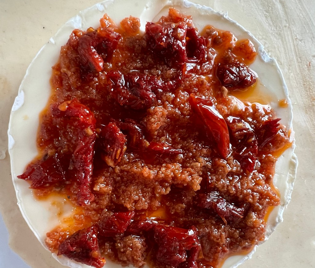 As with a traditional jam version, the Brie needs to be cut in half. With this recipe, I first spread a coat of tomato pesto followed by a tablespoon of chopped sun-dried tomato pieces (drain any oil from the sun-dried tomato). Then put the Brie back together.
