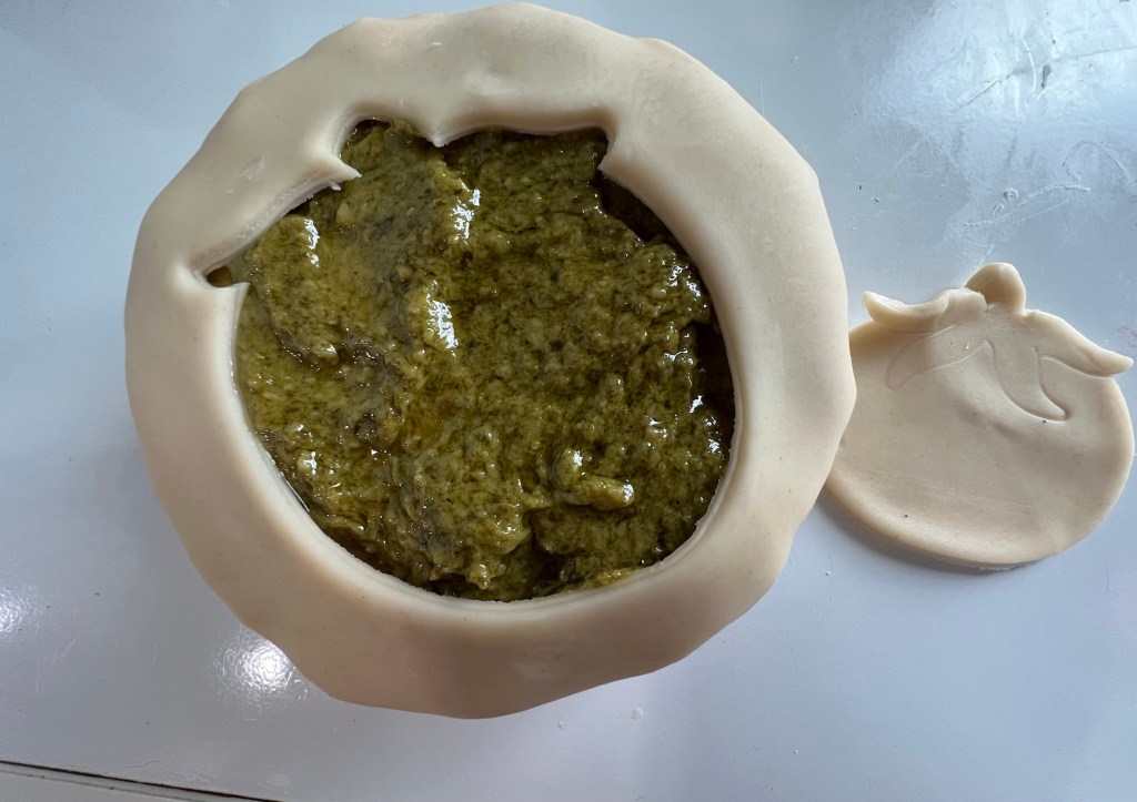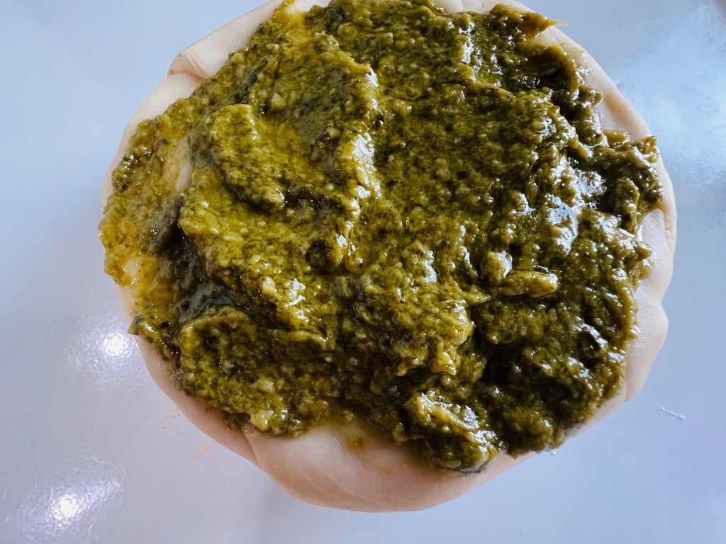 Next, pull out the pie crust and use a small rolling pin to make the dough thinner. Wrap the Brie in pie crust. Trim away the excess – roughly 25% of the crust. Cover the top of the pie-crust covered brie with jarred pesto sauce. Barilla sells a creamy style version that I like.