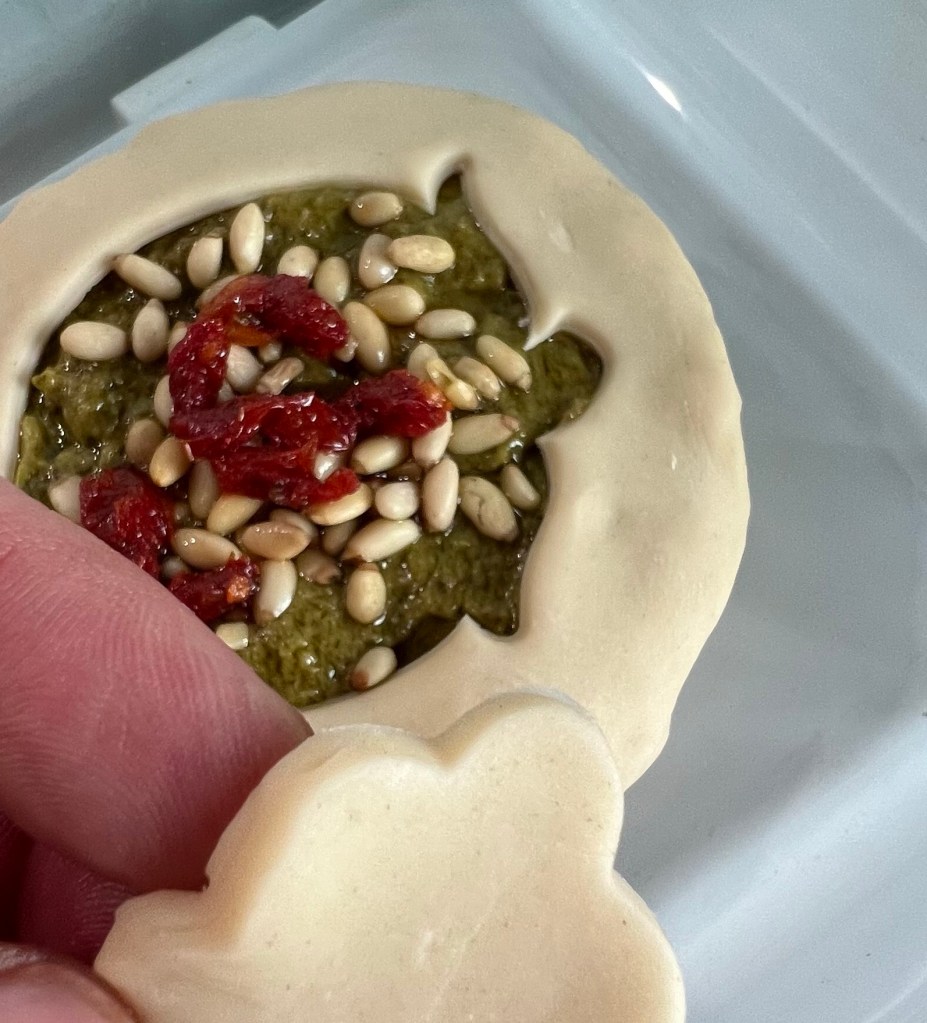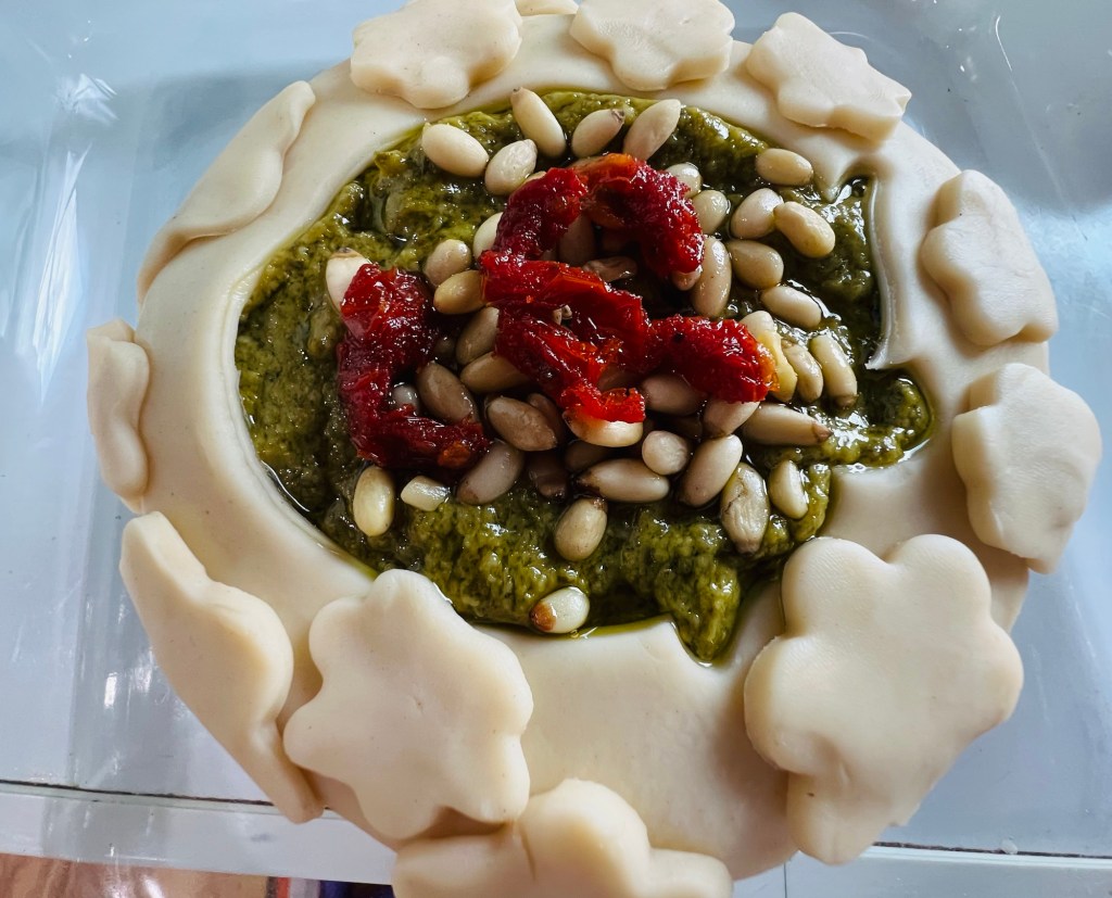 Also, I like to sprinkle a handful of pine nuts on top of the exposed pesto as well as a few pieces of diced sun-dried tomato, too.