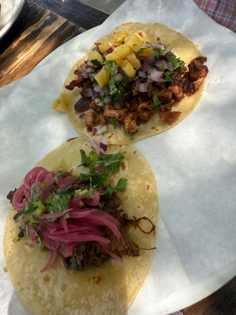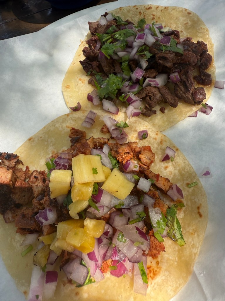Originally, this site was home to an automotive repair shop called Salazar. The restaurant opened in 2016. It’s an outdoor Mexican BBQ restaurant with a relaxed atmosphere . Even the salsa is made from scratch – starting with grilled tomatoes. The tacos were outstanding. The al pastor ones come with small pieces of grilled pineapple and a slight taste of heat.