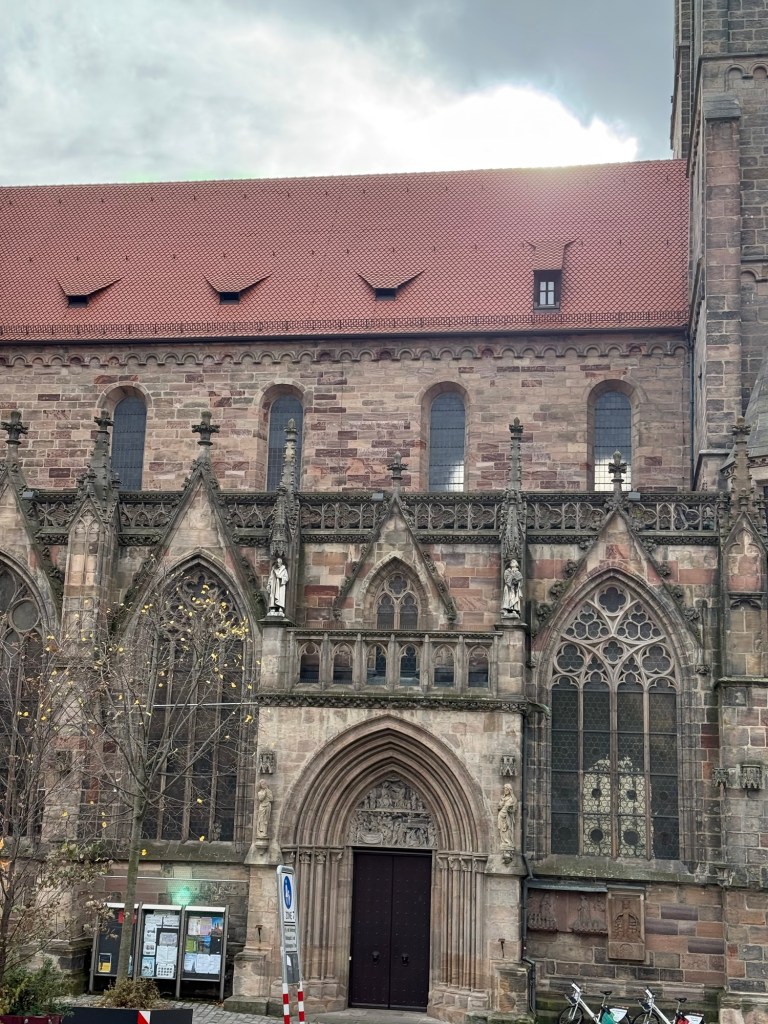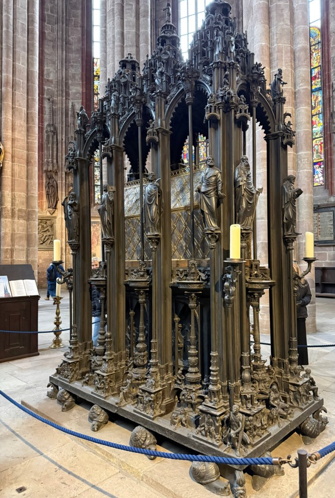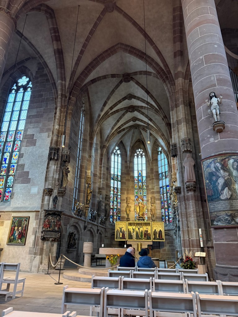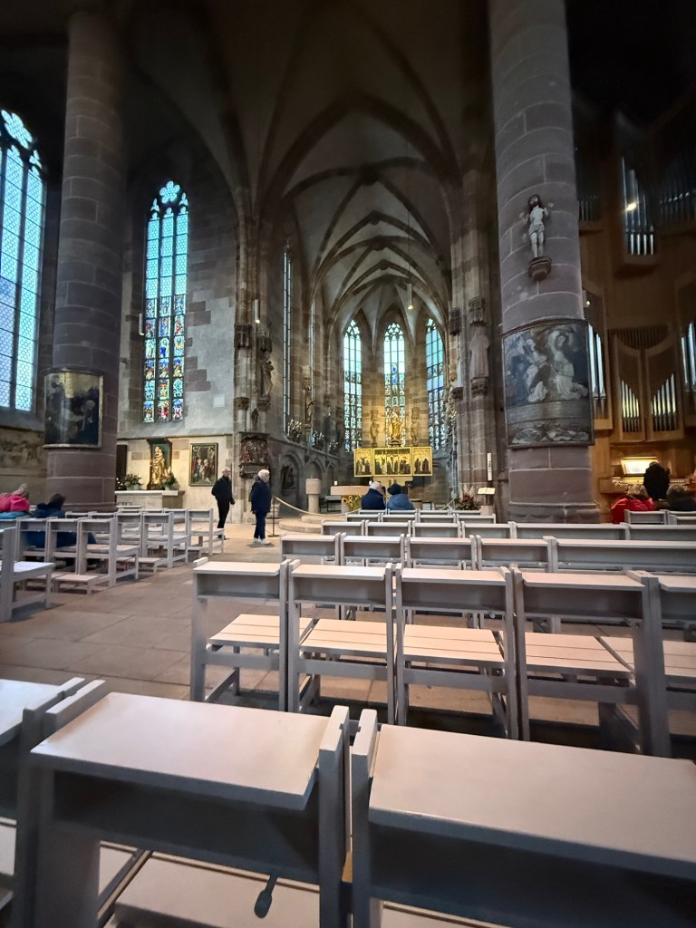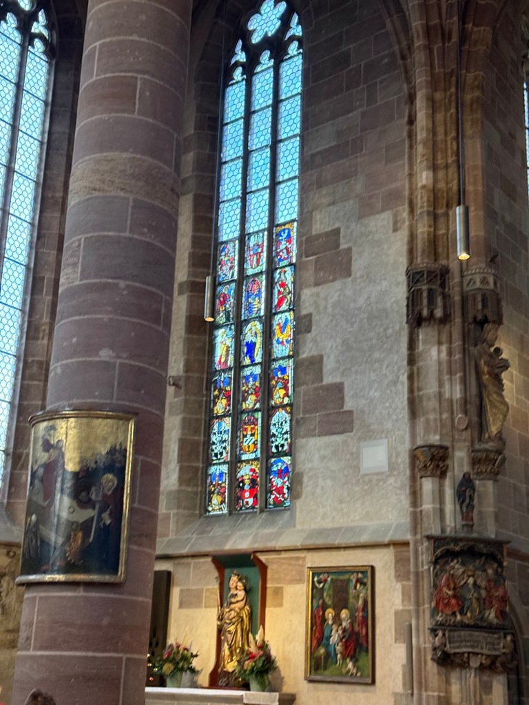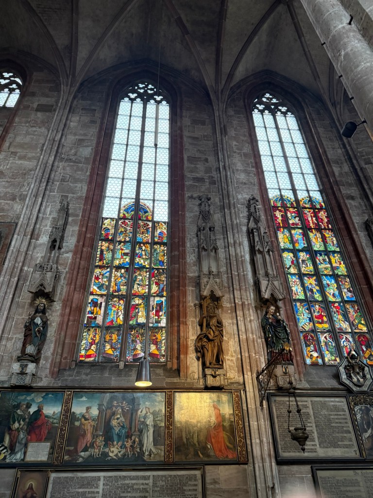 Luckily, we were able to take a tour of the places where the Nazis hid artwork during WWII, including stolen pieces. It was fascinating. Unlike the majority of Nuremberg’s buildings, these underground hiding spaces remained intact and safe from the bombings. One of the most miraculous things saved were all the stained glass windows from Saint Sebaldus. Much of the cathedral was damaged by the Allied bombing. After the war, the Germans rebuilt the cathedral and reinstalled the original glass panes.