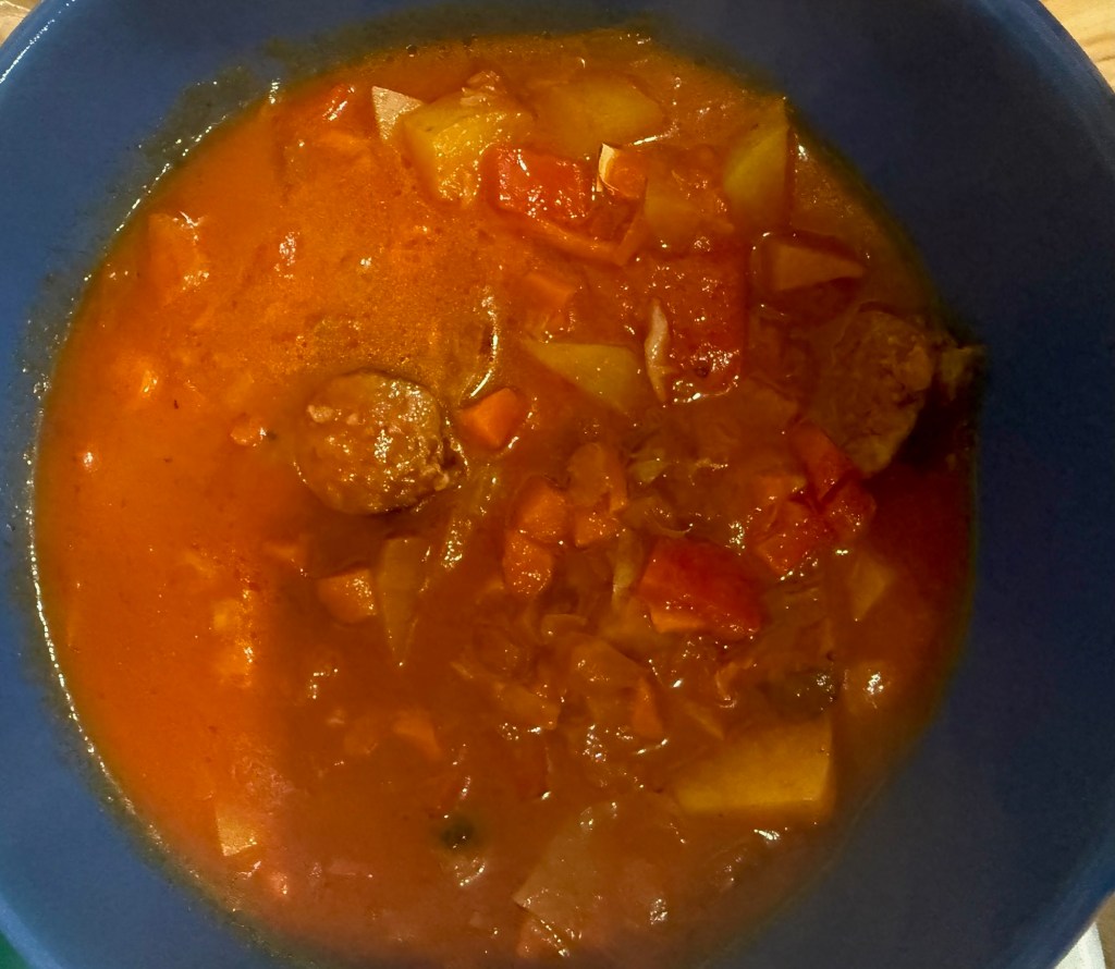 In a separate pan cook the sausage links until partially cooked. Cut into pieces and then add into the soup. Add in the shredded cabbage and salt and pepper to taste. Let the soup simmer for 20 minutes at medium heat.