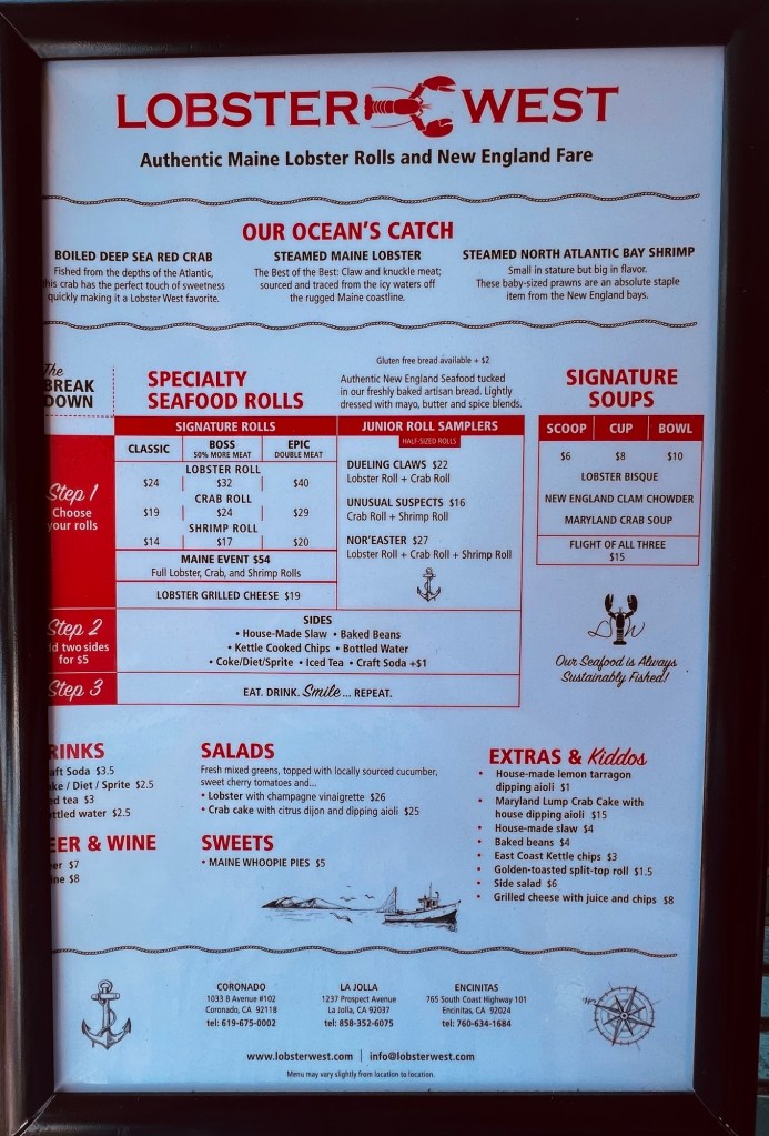 Locally, we go to Lobster West in Encinitas California for our sporadic fix. The place not only prepares the lobster perfectly but serves the sandwich on the perfect toasted roll with the right amount of melted butter! In addition, whenever I am in Massachusetts for one of my college reunions, I always make sure to enjoy a lobster roll.