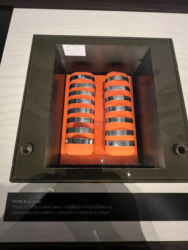 The Vietnam war section at the museum always holds particular memories for me. There is a collection of POW bracelets on display. I remember people, particularly, teenage girls, wearing them to honor American soldiers being held by the North Vietcong. Each bracelet has the name of a specific soldier. There is a very moving photo of a POW being reunited with his family at a U.S. airport, too.